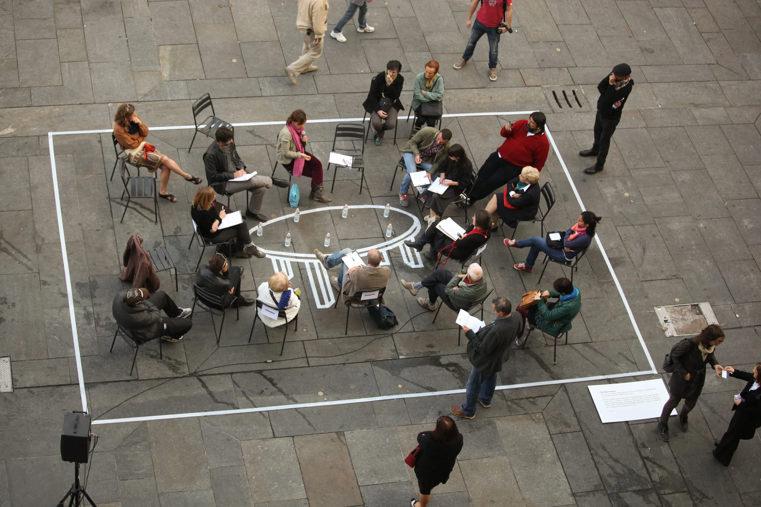 The Regenerators is a performative artwork that critically questions the role of the artists — and art in general — in processes of urban gentrification, and more specifically in relation to the Porta Palazzo district in Turin. The public space intervention “Action N° 1” was a round table in the middle of Piazza della Repubblica debating art and urban requalification strategies on the district. The square, which is the center of many business activities, once again took its role of place for the cultural debate like the ancient agorà. Both artists coordinated the round table discussion between invited experts, artists, and citizens. A cultural mediator was appointed to invite the public to participate in the discussion by informing them about the artwork and handing out (free) tickets. Ironically the round table, enclosed by a frame, was drawn on the floor with a caption.